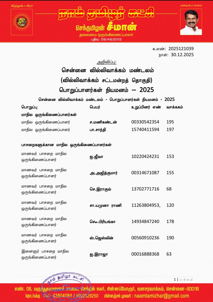 தலைமை அறிவிப்பு – சென்னை வில்லிவாக்கம் மண்டலம் (வில்லிவாக்கம் சட்டமன்றத் தொகுதி) பொறுப்பாளர்கள் நியமனம் – 2025