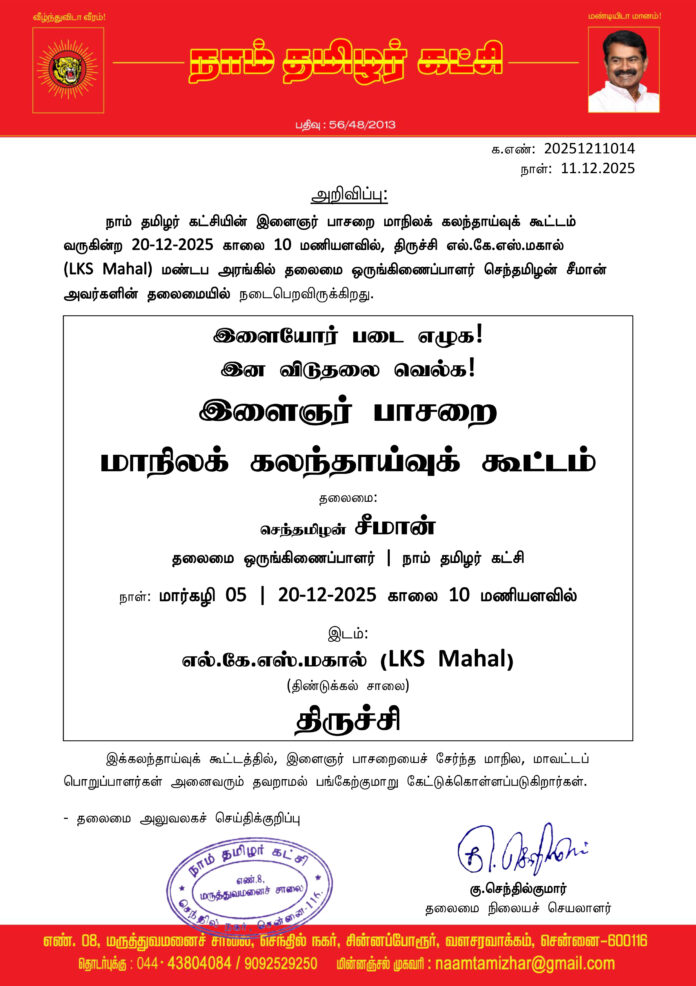நாம் தமிழர் கட்சியின் இளைஞர் பாசறை மாநிலக் கலந்தாய்வுக் கூட்டம் வருகின்ற 20-12-2025 காலை 10 மணியளவில், திருச்சி எல்.கே.எஸ்.மகால்