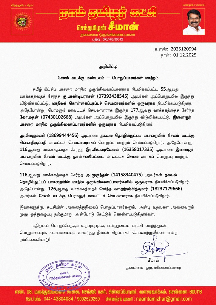 தமிழ் மீட்சிப் பாசறை மாநில ஒருங்கிணைப்பாளராக நியமிக்கப்பட்ட 55ஆவது வாக்ககத்தைச் சேர்ந்த கு.பாண்டியராசன் (07393438545) அவர்கள் அப்பொறுப்பில் இருந்து விடுவிக்கப்பட்டு, மாநிலக் கொள்கைப்பரப்புச் செயலாளர்களில் ஒருவராக நியமிக்கப்படுகிறார். அதேபோன்று, பெரமனுர் மாவட்டச் செயலாளராக இருந்த 177ஆவது வாக்ககத்தைச் சேர்ந்த லோ.மதன் (07430102668) அவர்கள் அப்பொறுப்பில் இருந்து விடுவிக்கப்பட்டு, இளைஞர் பாசறை மாநில ஒருங்கிணைப்பாளர்களில் ஒருவராக நியமிக்கப்படுகிறார்.