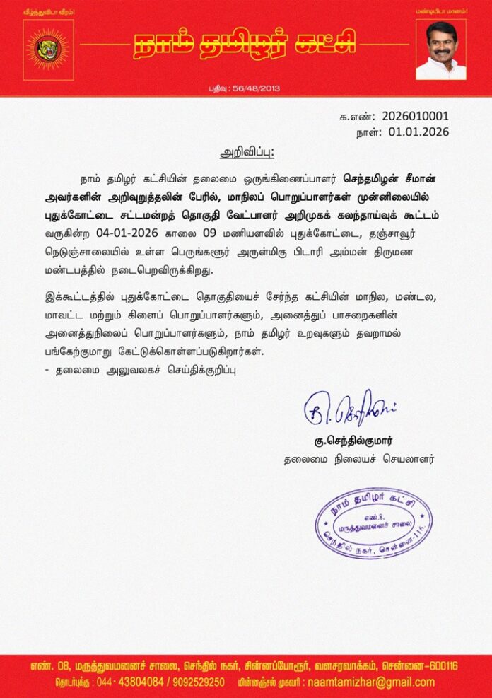 நாம் தமிழர் கட்சியின் தலைமை ஒருங்கிணைப்பாளர் செந்தமிழன் சீமான் அவர்களின் அறிவுறுத்தலின் பேரில், மாநிலப் பொறுப்பாளர்கள் முன்னிலையில் புதுக்கோட்டை சட்டமன்றத் தொகுதி வேட்பாளர் அறிமுகக் கலந்தாய்வுக் கூட்டம் வருகின்ற 04-01-2026 காலை 09 மணியளவில் புதுக்கோட்டை, தஞ்சாவூர் நெடுஞ்சாலையில் உள்ள பெருங்களூர் அருள்மிகு பிடாரி அம்மன் திருமண மண்டபத்தில் நடைபெறவிருக்கிறது.