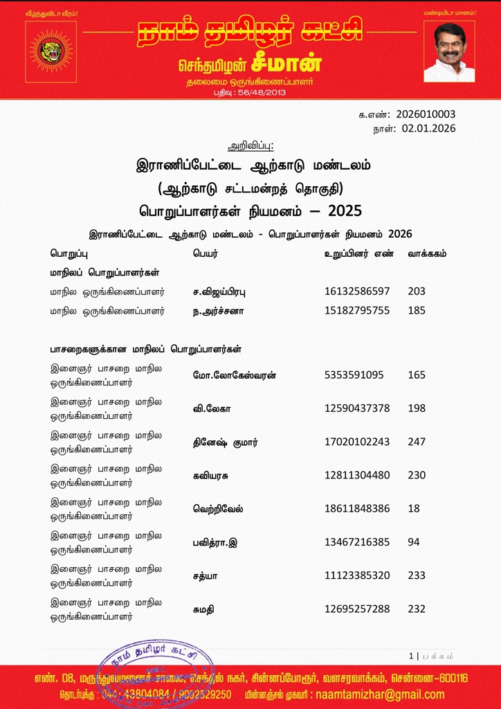 தலைமை அறிவிப்பு – இராணிப்பேட்டை ஆற்காடு மண்டலம் (ஆற்காடு சட்டமன்றத் தொகுதி) பொறுப்பாளர்கள் நியமனம் – 2025