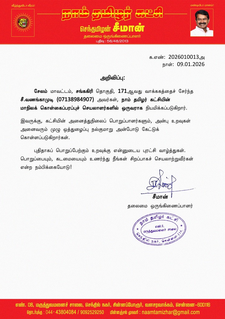 சேலம் மாவட்டம், சங்ககிரி தொகுதி, 171ஆவது வாக்ககத்தைச் சேர்ந்த சீ.வணங்காமுடி (07138984907) அவர்கள், நாம் தமிழர் கட்சியின் மாநிலக் கொள்கைப்பரப்புச் செயலாளர்களில் ஒருவராக நியமிக்கப்படுகிறார்.