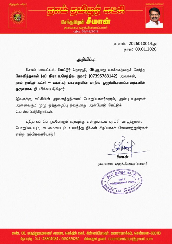 சேலம் மாவட்டம், மேட்டூர் தொகுதி, 06ஆவது வாக்ககத்தைச் சேர்ந்த கோவிந்தசாமி (எ) இரா.க.செந்தில் குமார் (07395783142) அவர்கள், நாம் தமிழர் கட்சி – வணிகர் பாசறையின் மாநில ஒருங்கிணைப்பாளர்களில் ஒருவராக நியமிக்கப்படுகிறார்.