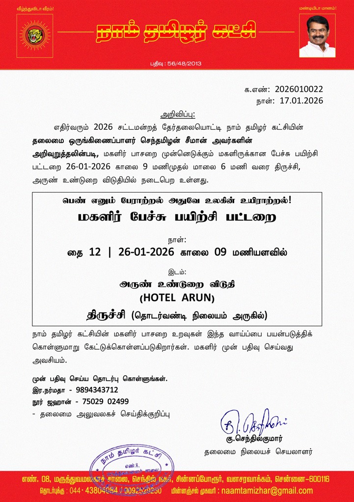 அறிவுறுத்தலின்படி, மகளிர் பாசறை முன்னெடுக்கும் மகளிருக்கான பேச்சு பயிற்சி பட்டறை 26-01-2026 காலை 9 மணிமுதல் மாலை 6 மணி வரை திருச்சி, அருண் உண்டுறை விடுதியில் நடைபெற உள்ளது.