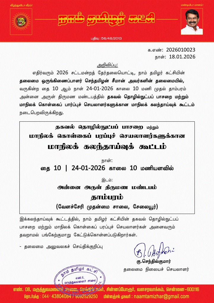எதிர்வரும் 2026 சட்டமன்றத் தேர்தலையொட்டி, நாம் தமிழர் கட்சியின் தலைமை ஒருங்கிணைப்பாளர் செந்தமிழன் சீமான் அவர்களின் தலைமையில், வருகின்ற தை 10 ஆம் நாள் 24-01-2026 காலை 10 மணி முதல் தாம்பரம் அன்னை அருள் திருமண மண்டபத்தில் தகவல் தொழில்நுட்பப் பாசறை மற்றும் மாநிலக் கொள்கைப் பார்ப்புச் செயலாளர்களுக்கான மாநிலக் கலந்தாய்வுக் கூட்டம் நடைபெறவிருக்கிறது.