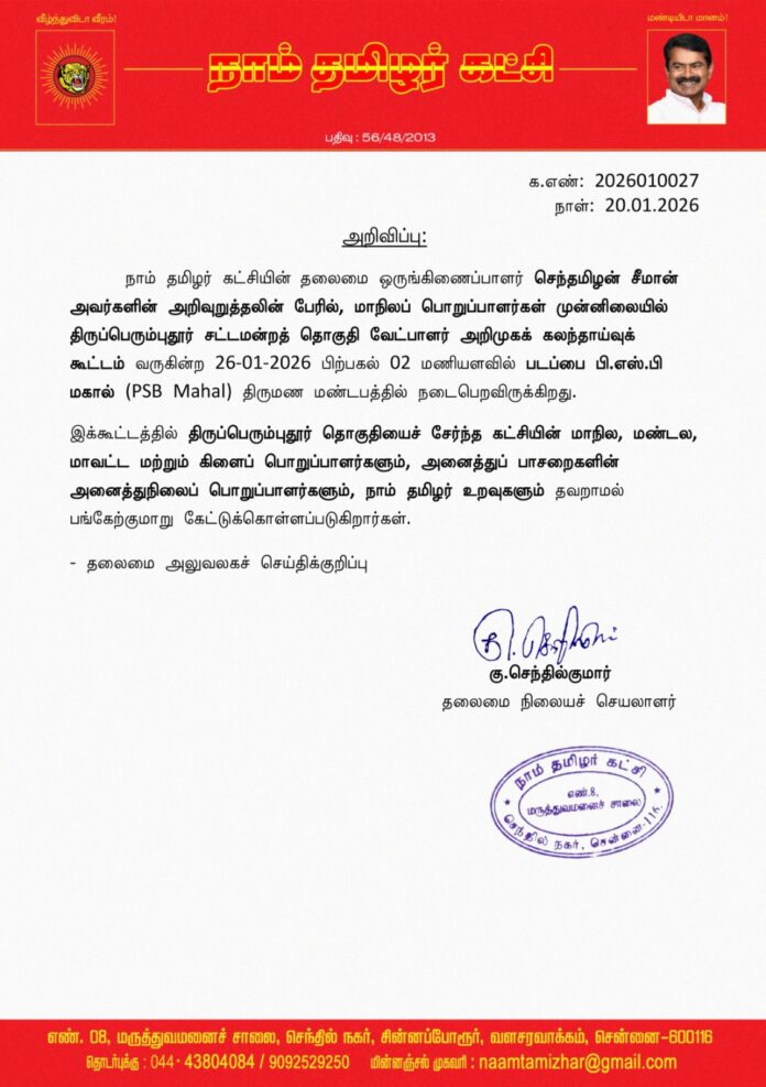 நாம் தமிழர் கட்சியின் தலைமை ஒருங்கிணைப்பாளர் செந்தமிழன் சீமான் அவர்களின் அறிவுறுத்தலின் பேரில், மாநிலப் பொறுப்பாளர்கள் முன்னிலையில் திருப்பெரும்புதூர் சட்டமன்றத் தொகுதி வேட்பாளர் அறிமுகக் கலந்தாய்வுக் கூட்டம் வருகின்ற 26-01-2026 பிற்பகல் 02 மணியளவில் படப்பை பி.எஸ்.பி மகால் (PSB Mahal) திருமண மண்டபத்தில் நடைபெறவிருக்கிறது.
