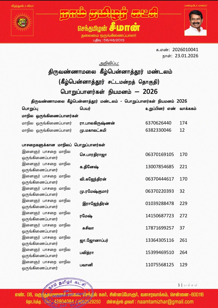 தலைமைச் செய்திகள்இளைஞர் பாசறைமகளிர் பாசறைகீழ்பென்னாத்தூர்அறிவிப்புகள்பொறுப்பாளர்கள் நியமனம்வீரத்தமிழர் முன்னணிமருத்துவப் பாசறைகுருதிக்கொடைப் பாசறைசுற்றுச்சூழல் பாசறைதகவல் தொழில்நுட்பப் பாசறை.தமிழ் மீட்சிப் பாசறைதிருவண்ணாமலை மாவட்டம்கலை இலக்கியப் பண்பாட்டுப் பாசறைவழக்கறிஞர் பாசறைஉழவர் பாசறைமாணவர் பாசறைவணிகர் பாசறைவிளையாட்டுப் பாசறைமுன்னாள் பாதுகாப்புப் படைவீரர்கள் பாசறைவீரக்கலைகள் பாசறை தலைமை அறிவிப்பு – திருவண்ணாமலை கீழ்பென்னாத்தூர் மண்டலம் (கீழ்பென்னாத்தூர் சட்டமன்றத் தொகுதி) பொறுப்பாளர்கள் நியமனம் ஜனவரி 27, 2026 8 க.எண்: 2026010041 நாள்: 23.01.2026 திருவண்ணாமலை கீழ்பென்னாத்தூர் மண்டலம் (கீழ்பென்னாத்தூர் சட்டமன்றத் தொகுதி) பொறுப்பாளர்கள் நியமனம்