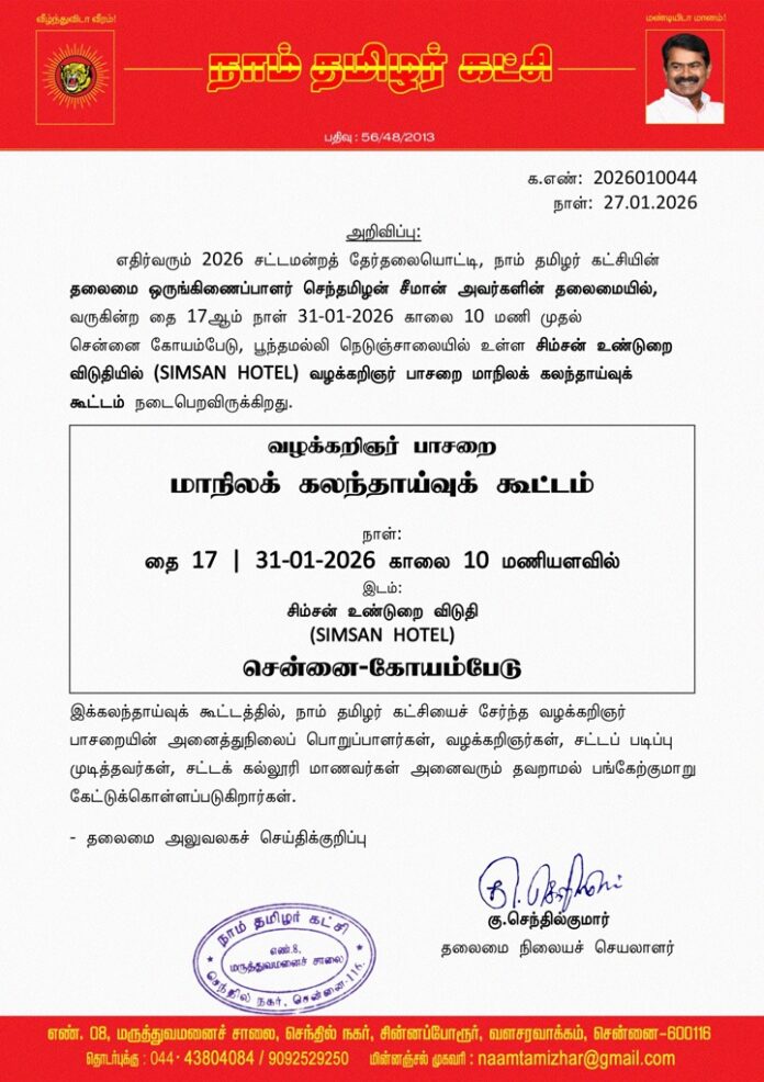 எதிர்வரும் 2026 சட்டமன்றத் தேர்தலையொட்டி, நாம் தமிழர் கட்சியின் தலைமை ஒருங்கிணைப்பாளர் செந்தமிழன் சீமான் அவர்களின் தலைமையில், வருகின்ற தை 17ஆம் நாள் 31-01-2026 காலை 10 மணி முதல்