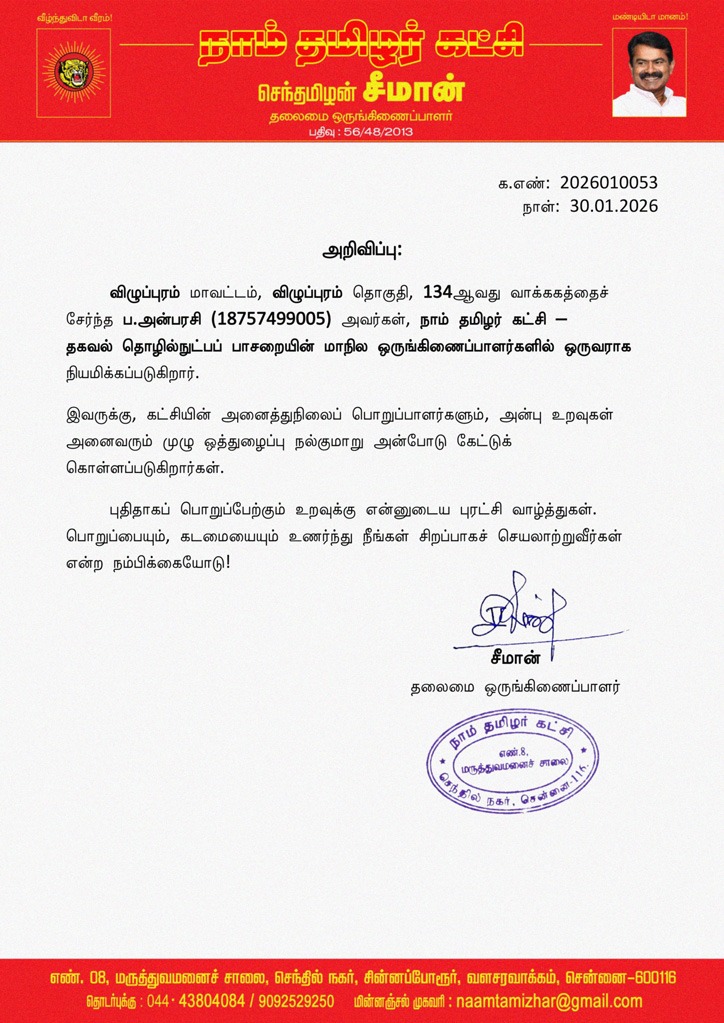 இவருக்கு, கட்சியின் அனைத்துநிலைப் பொறுப்பாளர்களும், அன்பு உறவுகள் அனைவரும் முழு ஒத்துழைப்பு நல்குமாறு அன்போடு கேட்டுக்