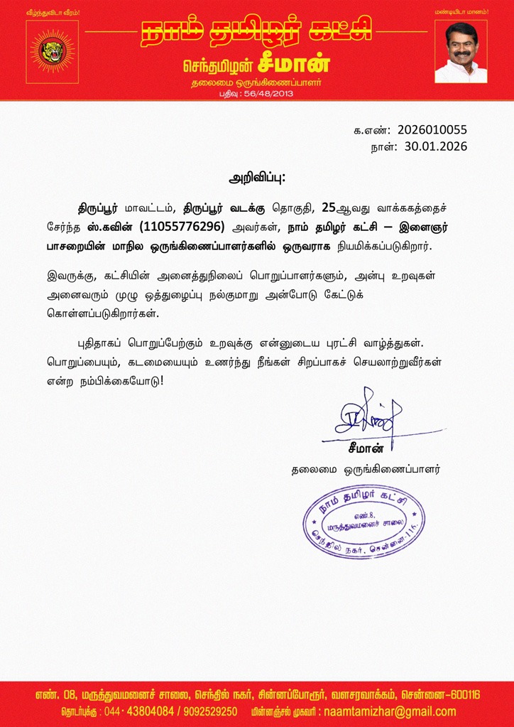 திருப்பூர் மாவட்டம், திருப்பூர் வடக்கு தொகுதி, 25ஆவது வாக்ககத்தைச் சேர்ந்த ஸ்.கவின் (11055776296) அவர்கள், நாம் தமிழர் கட்சி – இளைஞர் பாசறையின் மாநில ஒருங்கிணைப்பாளர்களில் ஒருவராக நியமிக்கப்படுகிறார்.