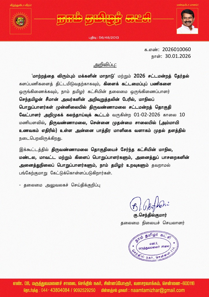 ‘மாற்றத்தை விரும்பும் மக்களின் மாநாடு’ மற்றும் 2026 சட்டமன்றத் தேர்தல் களப்பணிகளைத் திட்டமிடுவதற்காகவும், கிளைக் கட்டமைப்புப் பணிகளை ஒருங்கிணைக்கவும், நாம் தமிழர் கட்சியின் தலைமை ஒருங்கிணைப்பாளர் செந்தமிழன் சீமான் அவர்களின் அறிவுறுத்தலின் பேரில், மாநிலப் பொறுப்பாளர்கள் முன்னிலையில் திருவண்ணாமலை சட்டமன்றத் தொகுதி வேட்பாளர் அறிமுகக் கலந்தாய்வுக் கூட்டம் வருகின்ற 01-02-2026 காலை 10 மணியளவில், திருவண்ணாமலை, சென்னை முதன்மை சாலையில் (அம்மாயி உணவகம் எதிரில்) உள்ள அன்னை பாத்திர மாளிகை வளாகம் முதல் தளத்தில் நடைபெறவிருக்கிறது.
