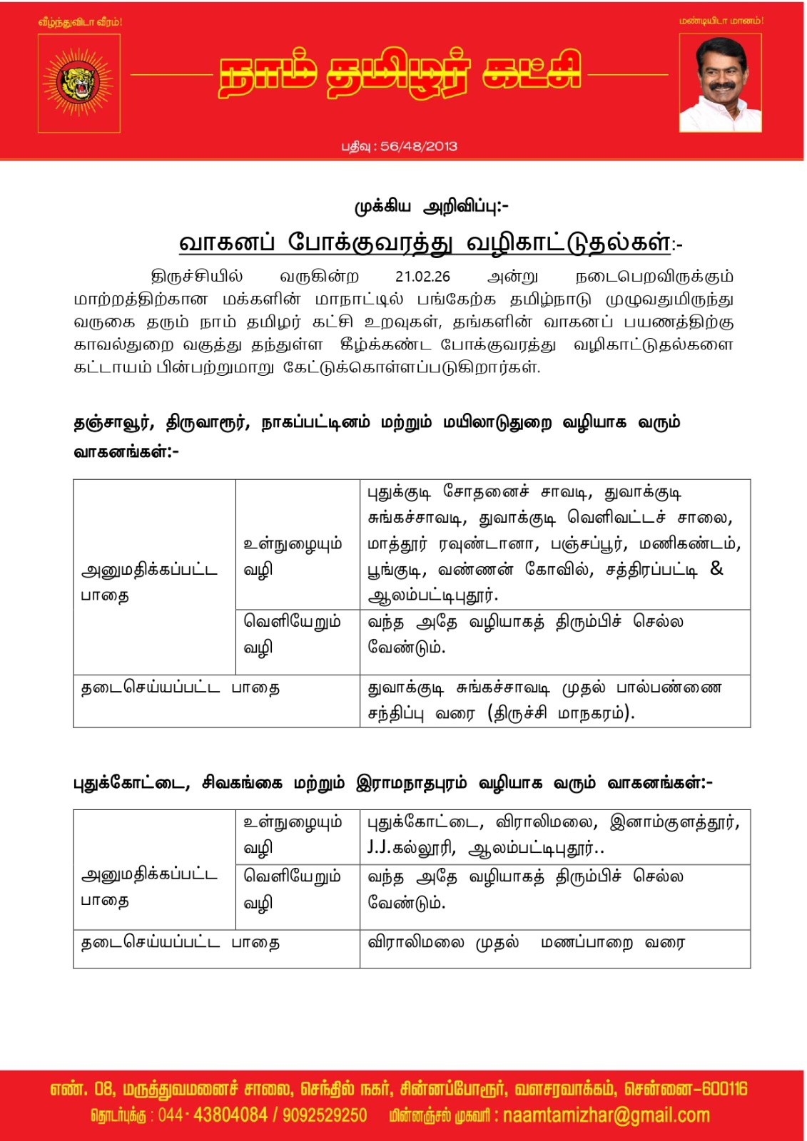 திருச்சியில் வருகின்ற 21.02.26 அன்று நடைபெறவிருக்கும் மாற்றத்திற்கான மக்களின் மாநாட்டில் பங்கேற்க தமிழ்நாடு முழுவதுமிருந்து வருகை தரும் நாம் தமிழர் கட்சி உறவுகள், தங்களின் வாகனப் பயணத்திற்கு காவல்துறை வகுத்து தந்துள்ள கீழ்க்கண்ட போக்குவரத்து வழிகாட்டுதல்களை கட்டாயம் பின்பற்றுமாறு கேட்டுக்கொள்ளப்படுகிறார்கள்.