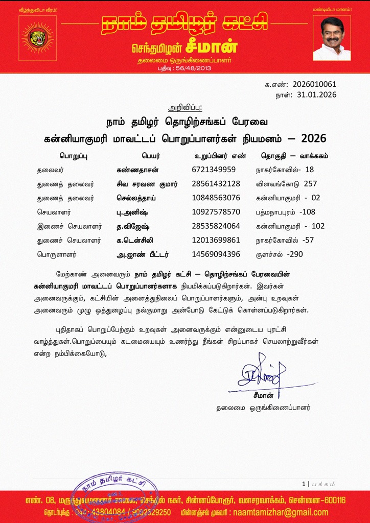 தலைமை அறிவிப்பு – நாம் தமிழர் தொழிற்சங்கப் பேரவை கன்னியாகுமரி மாவட்டப் பொறுப்பாளர்கள் நியமனம் 2026