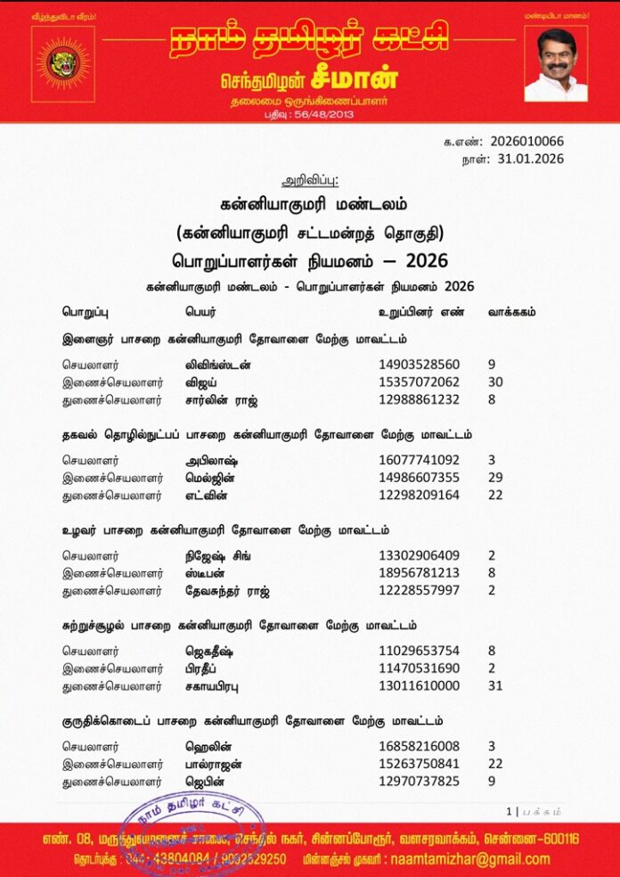 கன்னியாகுமரிதலைமைச் செய்திகள்அறிவிப்புகள்பொறுப்பாளர்கள் நியமனம்கன்னியாகுமரி மாவட்டம் தலைமை அறிவிப்பு – கன்னியாகுமரி மண்டலம் (கன்னியாகுமரி சட்டமன்றத் தொகுதி) பொறுப்பாளர்கள் நியமனம் பிப்ரவரி 4, 2026 6 க.எண்: 2026010066 நாள்: 31.01.2026 பொறுப்பு அறிவிப்பு: கன்னியாகுமரி மண்டலம் (கன்னியாகுமரி சட்டமன்றத் தொகுதி) பொறுப்பாளர்கள் நியமனம்