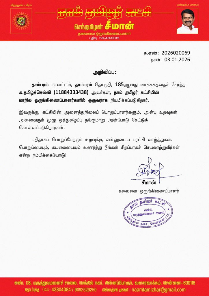 இவருக்கு, கட்சியின் அனைத்துநிலைப் பொறுப்பாளர்களும், அன்பு உறவுகள் அனைவரும் முழு ஒத்துழைப்பு நல்குமாறு அன்போடு கேட்டுக் கொள்ளப்படுகிறார்கள்.
