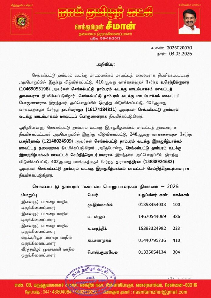 தலைமைச் செய்திகள்இளைஞர் பாசறைதாம்பரம்அறிவிப்புகள்பொறுப்பாளர்கள் நியமனம்செங்கல்பட்டு மாவட்டம்வீரத்தமிழர் முன்னணிவழக்கறிஞர் பாசறை தலைமை அறிவிப்பு – செங்கல்பட்டு தாம்பரம் மண்டலப் பொறுப்பாளர்கள் நியமனம் – 2026 பிப்ரவரி 4, 2026 10 க.எண்: 2026020070 நாள்: 03.02.2026 செங்கல்பட்டு தாம்பரம் மண்டலப் பொறுப்பாளர்கள் நியமனம் – 2026