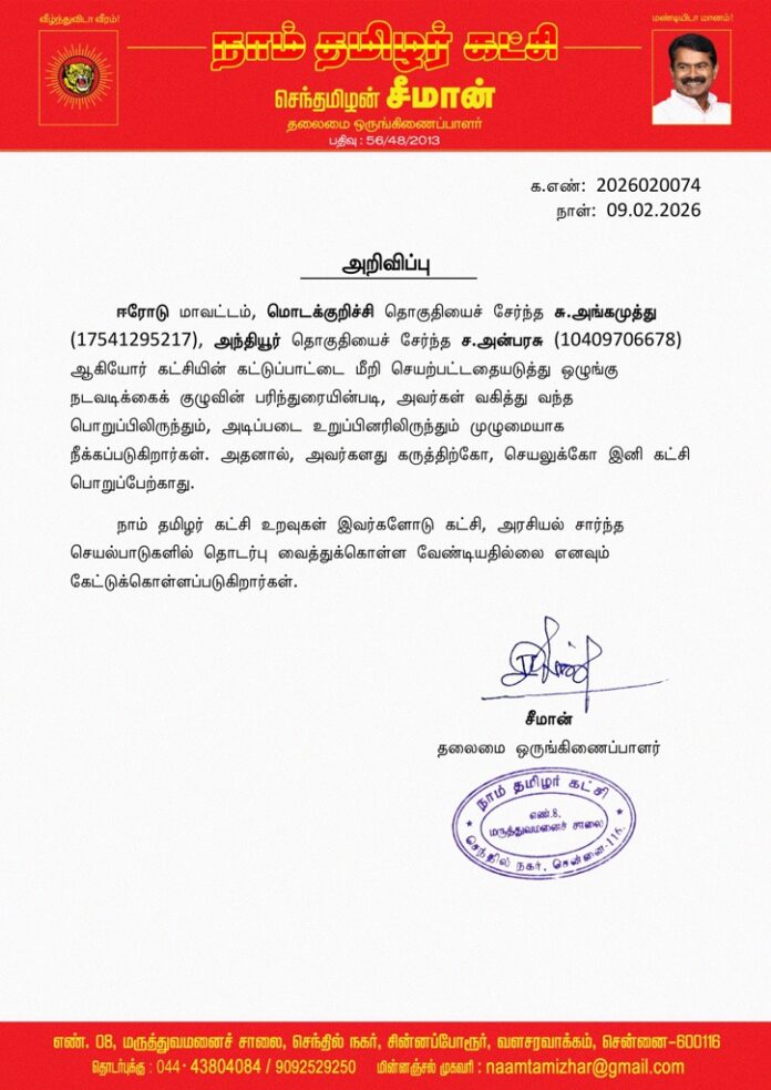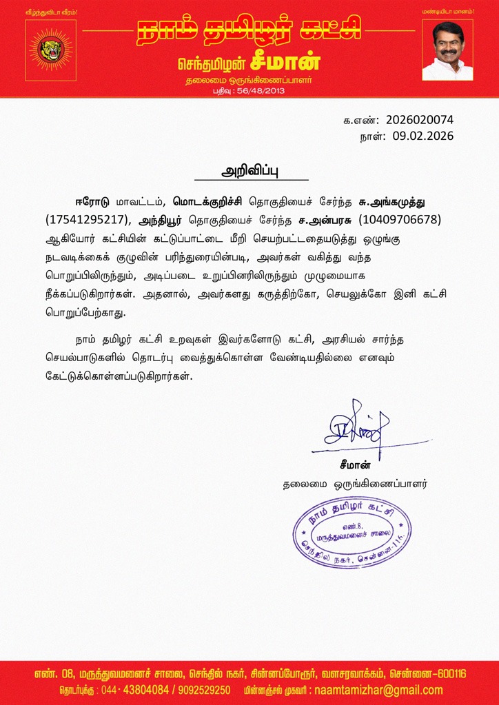 ஈரோடு மாவட்டம், மொடக்குறிச்சி தொகுதியைச் சேர்ந்த சு.அங்கமுத்து (17541295217), அந்தியூர் தொகுதியைச் சேர்ந்த ச.அன்பரசு (10409706678) ஆகியோர் கட்சியின் கட்டுப்பாட்டை மீறி செயற்பட்டதையடுத்து ஒழுங்கு நடவடிக்கைக் குழுவின் பரிந்துரையின்படி, அவர்கள் வகித்து வந்த பொறுப்பிலிருந்தும், அடிப்படை உறுப்பினரிலிருந்தும் முழுமையாக நீக்கப்படுகிறார்கள். அதனால், அவர்களது கருத்திற்கோ, செயலுக்கோ இனி கட்சி பொறுப்பேற்காது.