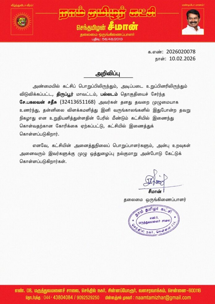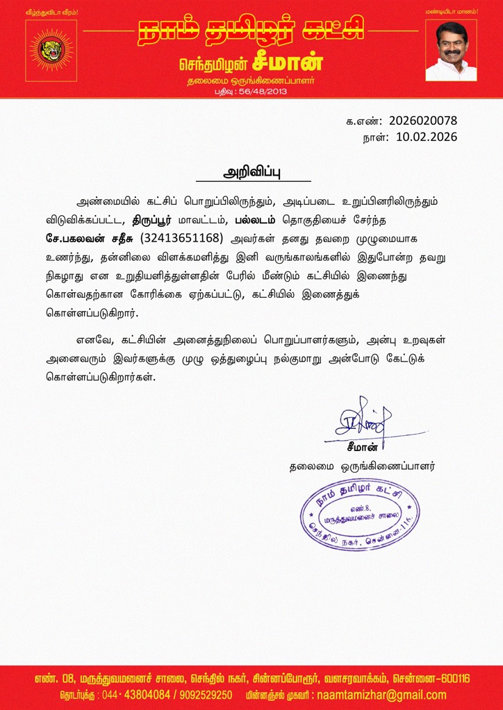 அண்மையில் கட்சிப் பொறுப்பிலிருந்தும், அடிப்படை உறுப்பினரிலிருந்தும் விடுவிக்கப்பட்ட, திருப்பூர் மாவட்டம், பல்லடம் தொகுதியைச் சேர்ந்த சே.பகலவன் சதீசு (32413651168) அவர்கள் தனது தவறை முழுமையாக உணர்ந்து, தன்னிலை விளக்கமளித்து இனி வருங்காலங்களில் இதுபோன்ற தவறு நிகழாது என உறுதியளித்துள்ளதின் பேரில் மீண்டும் கட்சியில் இணைந்து கொள்வதற்கான கோரிக்கை ஏற்கப்பட்டு, கட்சியில் இணைத்துக் கொள்ளப்படுகிறார்.