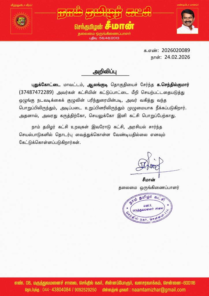 புதுக்கோட்டை மாவட்டம், ஆலங்குடி தொகுதியைச் சேர்ந்த க.செந்தில்குமார் (37487472289) அவர்கள் கட்சியின் கட்டுப்பாட்டை மீறி செயற்பட்டதையடுத்து ஒழுங்கு நடவடிக்கைக் குழுவின் பரிந்துரையின்படி, அவர் வகித்து வந்த பொறுப்பிலிருந்தும், அடிப்படை உறுப்பினரிலிருந்தும் முழுமையாக நீக்கப்படுகிறார். அதனால், அவரது கருத்திற்கோ, செயலுக்கோ இனி கட்சி பொறுப்பேற்காது.