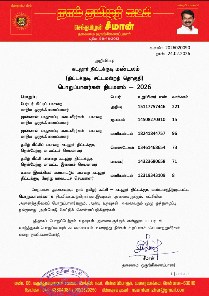 திட்டக்குடிதலைமைச் செய்திகள்அறிவிப்புகள்பொறுப்பாளர்கள் நியமனம்தகவல் தொழில்நுட்பப் பணியாளர்கள் பாசறைதமிழ் மீட்சிப் பாசறைகலை இலக்கியப் பண்பாட்டுப் பாசறைமுன்னாள் பாதுகாப்புப் படைவீரர்கள் பாசறைகடலூர் மாவட்டம் தலைமை அறிவிப்பு – கடலூர் திட்டக்குடி மண்டலம் (திட்டக்குடி சட்டமன்றத் தொகுதி) பொறுப்பாளர்கள் நியமனம் பிப்ரவரி 25, 2026 18 க.எண்: 2026020090 நாள்: 24.02.2026 கடலூர் திட்டக்குடி மண்டலம் (திட்டக்குடி சட்டமன்றத் தொகுதி) பொறுப்பாளர்கள் நியமனம் — 2026