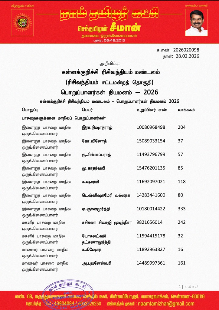 தலைமைச் செய்திகள்இரிஷிவந்தியம்அறிவிப்புகள்பொறுப்பாளர்கள் நியமனம்கள்ளக்குறிச்சி மாவட்டம் தலைமை அறிவிப்பு – கள்ளக்குறிச்சி ரிசிவந்தியம் மண்டலம் (ரிசிவந்தியம் சட்டமன்றத் தொகுதி) பொறுப்பாளர்கள் நியமனம் – 2026 மார்ச் 2, 2026 12 க.எண்: 2026020098 நாள்: 28.02.2026 கள்ளக்குறிச்சி ரிசிவந்தியம் மண்டலம் – பொறுப்பாளர்கள் நியமனம் 2026