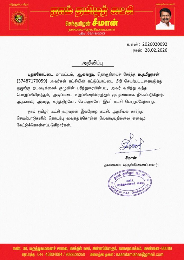நாம் தமிழர் கட்சி உறவுகள் இவரோடு கட்சி, அரசியல் சார்ந்த செயல்பாடுகளில் தொடர்பு வைத்துக்கொள்ள வேண்டியதில்லை எனவும்