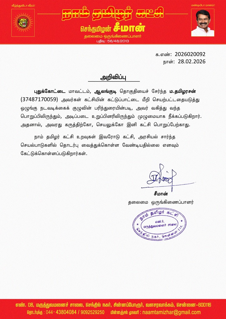 புதுக்கோட்டை மாவட்டம், ஆலங்குடி தொகுதியைச் சேர்ந்த ம.தமிழரசன் (37487170059) அவர்கள் கட்சியின் கட்டுப்பாட்டை மீறி செயற்பட்டதையடுத்து ஒழுங்கு நடவடிக்கைக் குழுவின் பரிந்துரையின்படி, அவர் வகித்து வந்த பொறுப்பிலிருந்தும், அடிப்படை உறுப்பினரிலிருந்தும் முழுமையாக நீக்கப்படுகிறார். அதனால், அவரது கருத்திற்கோ, செயலுக்கோ இனி கட்சி பொறுப்பேற்காது.