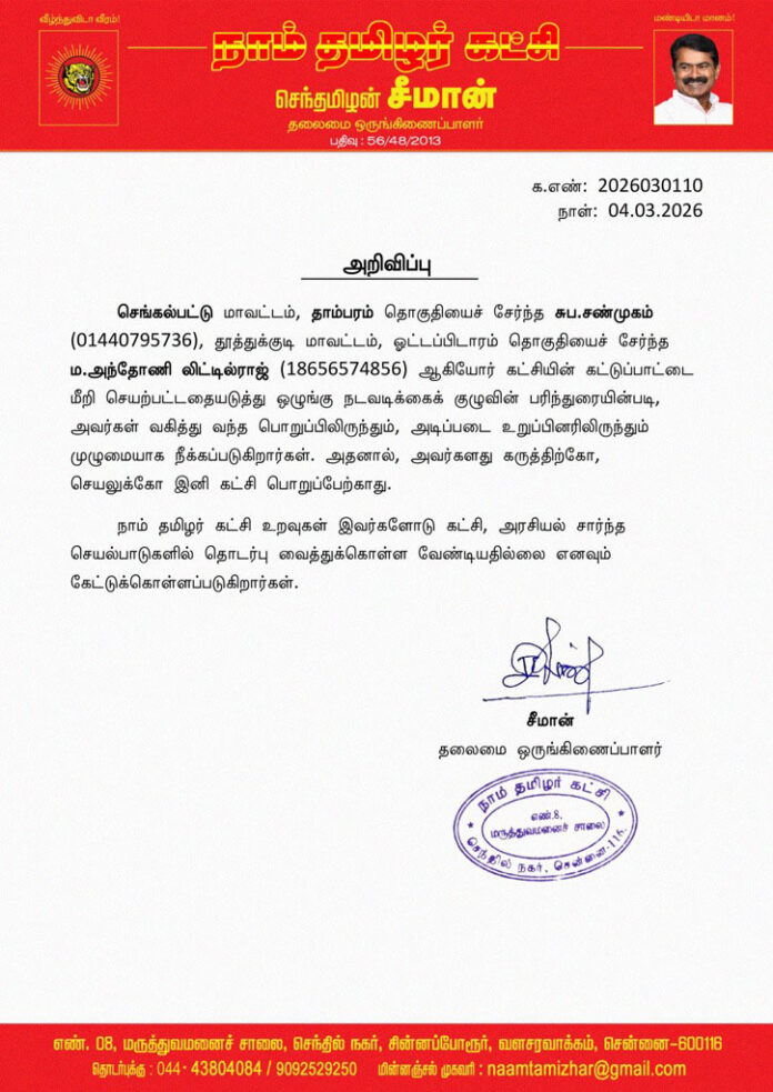 செங்கல்பட்டு மாவட்டம், தாம்பரம் தொகுதியைச் சேர்ந்த சுப.சண்முகம் (01440795736), தூத்துக்குடி மாவட்டம், ஓட்டப்பிடாரம் தொகுதியைச் சேர்ந்த ம.அந்தோணி லிட்டில்ராஜ் (18656574856) ஆகியோர் கட்சியின் கட்டுப்பாட்டை மீறி செயற்பட்டதையடுத்து ஒழுங்கு நடவடிக்கைக் குழுவின் பரிந்துரையின்படி, அவர்கள் வகித்து வந்த பொறுப்பிலிருந்தும், அடிப்படை உறுப்பினரிலிருந்தும் முழுமையாக நீக்கப்படுகிறார்கள். அதனால், அவர்களது கருத்திற்கோ, செயலுக்கோ இனி கட்சி பொறுப்பேற்காது.