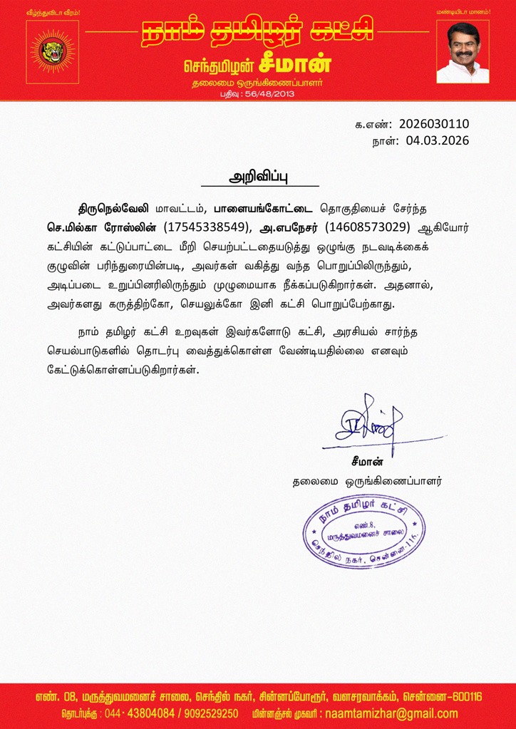 திருநெல்வேலி மாவட்டம், பாளையங்கோட்டை தொகுதியைச் சேர்ந்த செ.மில்கா ரோஸ்லின் (17545338549), அ.எபநேசர் (14608573029) ஆகியோர் கட்சியின் கட்டுப்பாட்டை மீறி செயற்பட்டதையடுத்து ஒழுங்கு நடவடிக்கைக் குழுவின் பரிந்துரையின்படி, அவர்கள் வகித்து வந்த பொறுப்பிலிருந்தும், அடிப்படை உறுப்பினரிலிருந்தும் முழுமையாக நீக்கப்படுகிறார்கள். அதனால், அவர்களது கருத்திற்கோ, செயலுக்கோ இனி கட்சி பொறுப்பேற்காது.