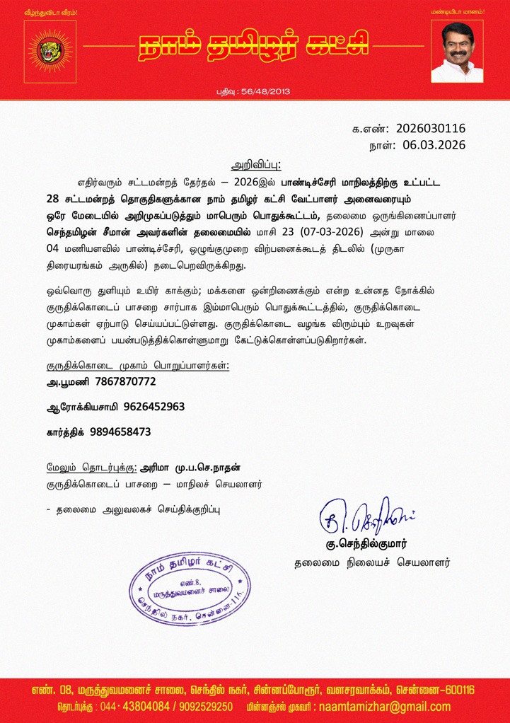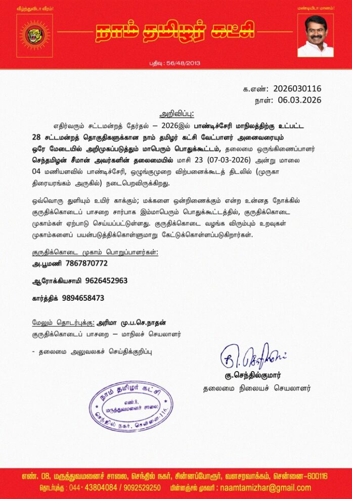 28 சட்டமன்றத் தொகுதிகளுக்கான நாம் தமிழர் கட்சி வேட்பாளர் அனைவரையும் ஒரே மேடையில் அறிமுகப்படுத்தும் மாபெரும் பொதுக்கூட்டம், தலைமை ஒருங்கிணைப்பாளர் செந்தமிழன் சீமான் அவர்களின் தலைமையில் மாசி 23 (07-03-2026) அன்று மாலை 04 மணியளவில் பாண்டிச்சேரி, ஒழுங்குமுறை விற்பனைக்கூடத் திடலில் (முருகா திரையரங்கம் அருகில்) நடைபெறவிருக்கிறது.