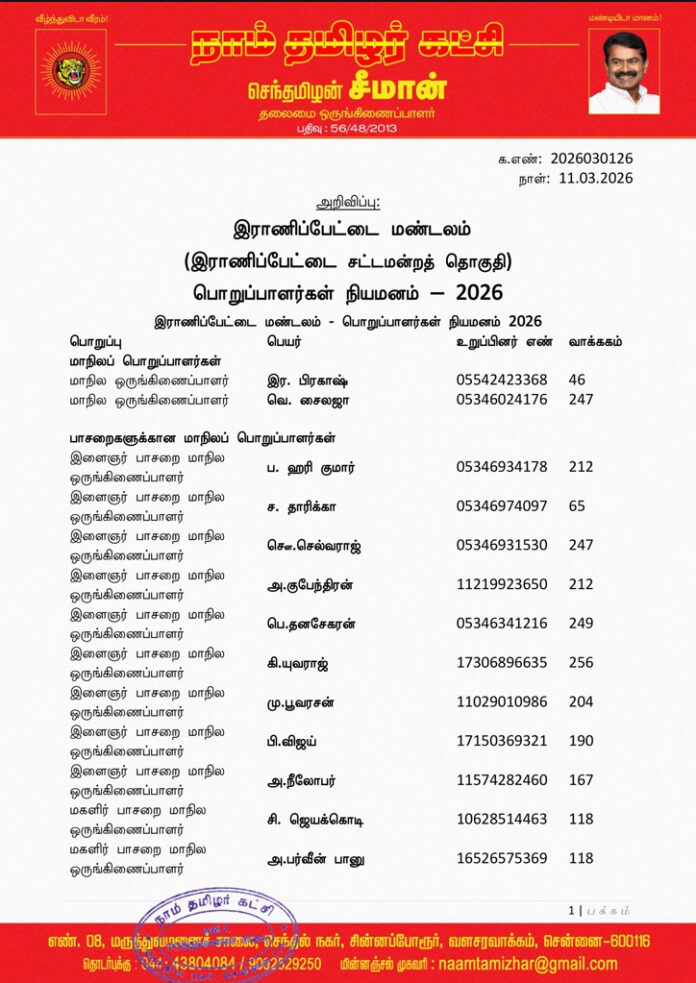 தலைமைச் செய்திகள்இளைஞர் பாசறைமகளிர் பாசறைஇராணிப்பேட்டைஅறிவிப்புகள்பொறுப்பாளர்கள் நியமனம்மருத்துவப் பாசறைகுருதிக்கொடைப் பாசறைசுற்றுச்சூழல் பாசறைஇராணிப்பேட்டை மாவட்டம்தகவல் தொழில்நுட்பப் பாசறை.தமிழ் மீட்சிப் பாசறைகலை இலக்கியப் பண்பாட்டுப் பாசறைவழக்கறிஞர் பாசறைஉழவர் பாசறைமாணவர் பாசறைவணிகர் பாசறைவிளையாட்டுப் பாசறை தலைமை அறிவிப்பு – இராணிப்பேட்டை மண்டலம் – பொறுப்பாளர்கள் நியமனம் 2026 மார்ச் 13, 2026 16 க.எண்: 2026030126 நாள்: 11.03.2026 இராணிப்பேட்டை மண்டலம் – பொறுப்பாளர்கள் நியமனம் 2026