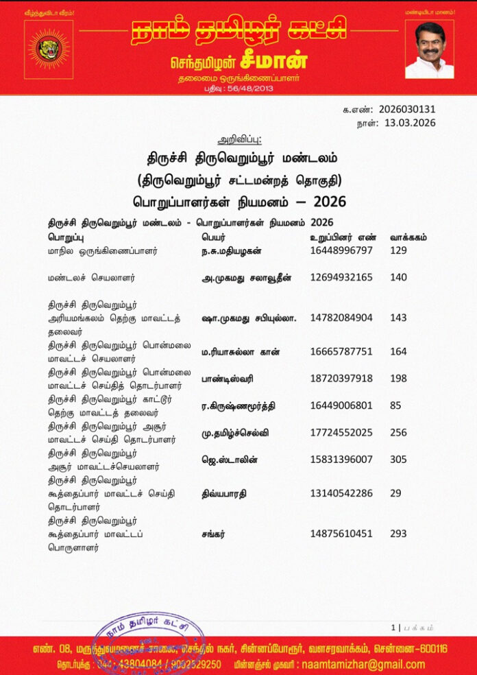 தலைமைச் செய்திகள்அறிவிப்புகள்பொறுப்பாளர்கள் நியமனம்திருவெறும்பூர்திருச்சிராப்பள்ளி மாவட்டம் தலைமை அறிவிப்பு – திருச்சி திருவெறும்பூர் மண்டலம் – பொறுப்பாளர்கள் நியமனம் 2026 மார்ச் 14, 2026 16 க.எண்: 2026030131 நாள்: 13.03.2026 திருச்சி திருவெறும்பூர் மண்டலம் (திருவெறும்பூர் சட்டமன்றத் தொகுதி) பொறுப்பாளர்கள் நியமனம் -2026