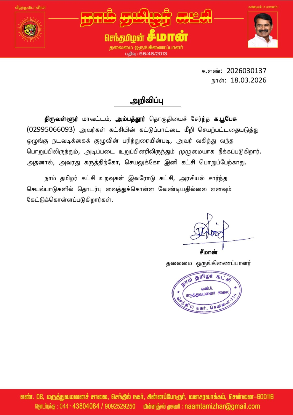 திருவள்ளூர் மாவட்டம், அம்பத்தூர் தொகுதியைச் சேர்ந்த க.பூபேசு (02995066093) அவர்கள் கட்சியின் கட்டுப்பாட்டை மீறி செயற்பட்டதையடுத்து ஒழுங்கு நடவடிக்கைக் குழுவின் பரிந்துரையின்படி, அவர் வகித்து வந்த பொறுப்பிலிருந்தும், அடிப்படை உறுப்பினரிலிருந்தும் முழுமையாக நீக்கப்படுகிறார். அதனால், அவரது கருத்திற்கோ, செயலுக்கோ இனி கட்சி பொறுப்பேற்காது.
