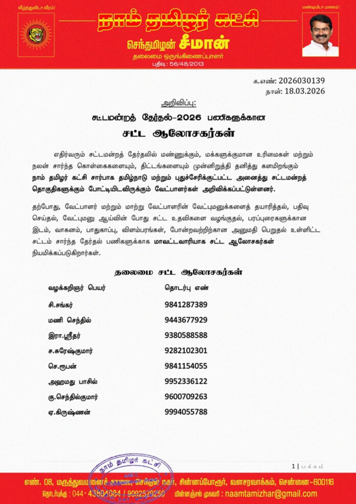 தலைமை அறிவிப்பு – சட்டமன்றத் தேர்தல்-2026 பணிகளுக்கான சட்ட ஆலோசகர்கள்
