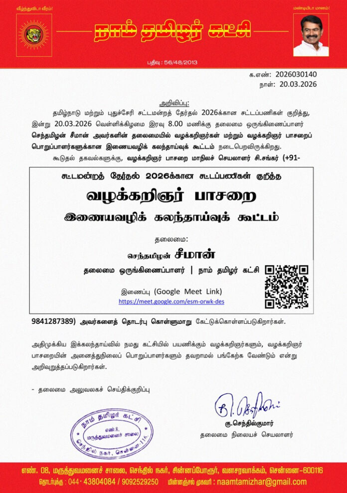 தமிழ்நாடு மற்றும் புதுச்சேரி சட்டமன்றத் தேர்தல் 2026க்கான சட்டப்பணிகள் குறித்து, இன்று 20.03.2026 வெள்ளிக்கிழமை இரவு 8.00 மணிக்கு தலைமை ஒருங்கிணைப்பாளர் செந்தமிழன் சீமான் அவர்களின் தலைமையில் வழக்கறிஞர்கள் மற்றும் வழக்கறிஞர் பாசறைப் பொறுப்பாளர்களுக்கான இணையவழிக் கலந்தாய்வுக் கூட்டம் நடைபெறவிருக்கிறது.