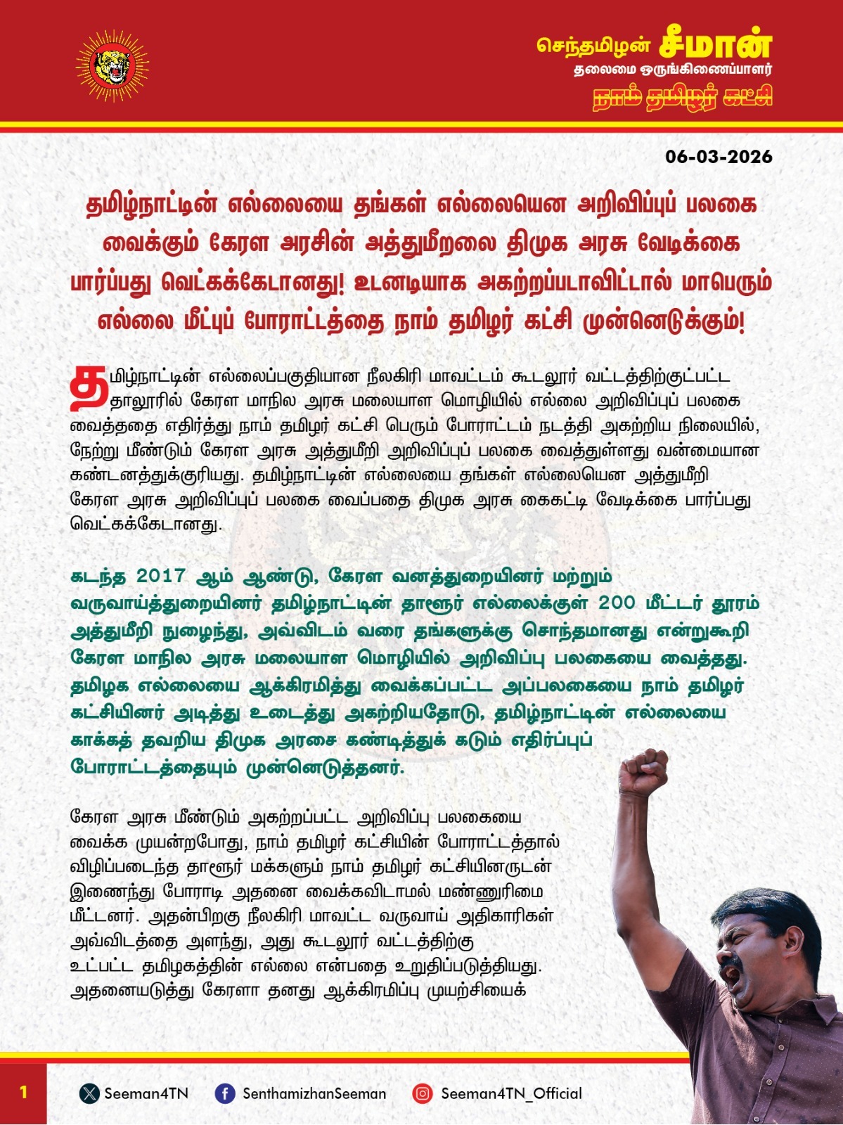 தமிழ்நாட்டின் எல்லைப்பகுதியான நீலகிரி மாவட்டம் கூடலூர் வட்டத்திற்குட்பட்ட தாலூரில் கேரள மாநில அரசு மலையாள மொழியில் எல்லை அறிவிப்புப் பலகை வைத்ததை எதிர்த்து நாம் தமிழர் கட்சி பெரும் போராட்டம் நடத்தி அகற்றிய நிலையில், நேற்று மீண்டும் கேரள அரசு அத்துமீறி அறிவிப்புப் பலகை வைத்துள்ளது வன்மையான கண்டனத்துக்குரியது. தமிழ்நாட்டின் எல்லையை தங்கள் எல்லையென அத்துமீறி கேரள அரசு அறிவிப்புப் பலகை வைப்பதை திமுக அரசு கைகட்டி வேடிக்கை பார்ப்பது வெட்கக்கேடானது. கடந்த 2017 ஆம் ஆண்டு, கேரள வனத்துறையினர் மற்றும் வருவாய்த்துறையினர் தமிழ்நாட்டின் தாலூர் எல்லைக்குள் 200 மீட்டர் தூரம் அத்துமீறி நுழைந்து, அவ்விடம் வரை தங்களுக்கு சொந்தமானது என்றுகூறி கேரள மாநில அரசு மலையாள மொழியில் அறிவிப்பு பலகையை வைத்தது. தமிழக எல்லையை ஆக்கிரமித்து வைக்கப்பட்ட அப்பலகையை நாம் தமிழர் கட்சியினர் அடித்து உடைத்து அகற்றியதோடு, தமிழ்நாட்டின் எல்லையை காக்கத் தவறிய திமுக அரசை கண்டித்துக் கடும் எதிர்ப்புப் போராட்டத்தையும் முன்னெடுத்தது. கேரள அரசு மீண்டும் அகற்றப்பட்ட அறிவிப்பு பலகையை வைக்க முயன்றபோது, நாம் தமிழர் கட்சியின் போராட்டத்தால் விழிப்படைந்த தாலூர் மக்களும் நாம் தமிழர் கட்சியுடன் இணைந்து போராடி அதனை வைக்க விடாமல் மண்ணுரிமை மீட்டனர். அதன்பிறகு நீலகிரி மாவட்ட வருவாய் அதிகாரிகள் அவ்விடத்தை அளந்து, அது கூடலூர் வட்டத்திற்கு உட்பட்ட தமிழகத்தின் எல்லை என்பதை உறுதிப்படுத்தியது. அதனையடுத்து கேரளா தனது ஆக்கிரமிப்பு முயற்சியைக் கைவிட்ட நிலையில், கடந்த 2023 ஆம் ஆண்டு மீண்டும் கேரள அரசு தமிழக எல்லைக்குள் அறிவிப்பு பலகையும் பேருந்து நிலையமும் அமைக்க முயன்றதையும் நாம் தமிழர் கட்சி போராடி தடுத்து நிறுத்தியது. இந்நிலையில், நேற்று மீண்டும் தமிழக எல்லைக்குள் தமிழ்நாடு அரசு தமிழில் வைத்த அறிவிப்பு பலகையை உடைத்து எறிந்துவிட்டு, கேரள அரசு மலையாள அறிவிப்பு பலகையை அத்துமீறி வைத்துள்ளது. இதனை எதிர்த்து நாம் தமிழர் கட்சி பொறுப்பாளர்கள் நேற்று இரவு முதல் போராட்டம் நடத்தி வரும் நிலையில், கேரள மாநில அரசு கேரள காவல்துறையினரை குவித்து, தமிழக எல்லைக்குள் அத்துமீறி நடப்பட்ட அறிவிப்பு பலகையைப் பாதுகாத்து வருகிறது. ஆனால், தமிழ்நாடு எல்லை பலகையை காக்கத் தவறிய தமிழ்நாடு காவல்துறையோ, எல்லை மீட்புக்காகப் போராடும் நாம் தமிழர் கட்சியினரை தடுத்து நிறுத்துகின்றது. தமிழ்நாடு எல்லையைப் பாதுகாக்க திறனற்ற திமுக அரசு போராடும் நாம் தமிழர் கட்சியினரை அடக்கி ஒடுக்குவது ஏன்? இதுதான் திமுக அரசு மண்ணையும், மானத்தையும் காக்கும் முறையா? முல்லைப்பெரியாறு அ