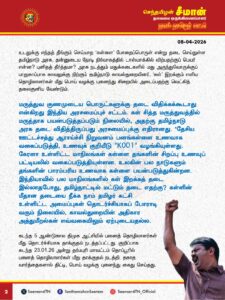 உடலுக்கு எந்தத் தீங்கும் செய்யாத ‘கள்ளை’ போதைப்பொருள் என்று தடை செய்துள்ள தமிழ்நாடு அரசு, தன்னுடைய நேரடி நிர்வாகத்தில் டாஸ்மாக்கில் விற்பதற்குப் பெயர் என்ன? புனிதத் தீர்த்தமா? அரசு நடத்தும் மதுக்கடைகளில் மது அருந்துவோருக்குப் பாதுகாப்பாக காவலுக்கு நிற்கும் தமிழ்நாடு காவல்துறையினர், ‘கள்’ இறக்கும் எளிய தொழிலாளர்கள் மீது பொய் வழக்கு புனைந்து சிறையில் அடைப்பதற்கு வெட்கித் தலைகுனிய வேண்டும்.