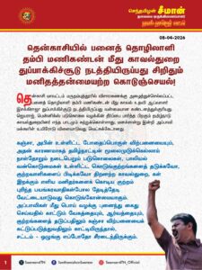 தென்காசி மாவட்டம் மருதம்புத்தூரில் விசாரணைக்கு அழைத்துச்செல்லப்பட்ட பனைத் தொழிலாளி தம்பி மணிகண்டன் மீது காவல் உதவி ஆய்வாளர் இசக்கிராஜா துப்பாக்கிச்சூடு நடத்தியிருப்பது வன்மையான கண்டனத்துக்குரியது. ஜெயராஜ், பென்னிக்ஸ் படுகொலை வழக்கின் தீர்ப்பை பார்த்த பிறகும் தமிழ்நாடு காவல்துறையினர் எந்த பாடமும் கற்றுக்கொள்ளாது, மனச்சான்று இன்றி அப்பாவி மக்களின் உயிரோடு விளையாடுவது வெட்கக்கேடானது.