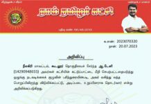 க.எண்: 2023070335                                              நாள்: 29.07.2023 அறிவிப்பு: கோயம்புத்தூர் மாவட்டம், கவுண்டம்பாளையம் தொகுதியைச் சேர்ந்த ப.முருக சந்திரகுமார் (16304037349), அவர்கள் நாம் தமிழர் கட்சி – தகவல் தொழில்நுட்பப் பாசறையின் ஒருங்கிணைந்த கோயம்புத்தூர் மாவட்டச் செயலாளராக நியமிக்கப்படுகிறார். இவருக்கு,...