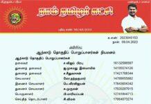 க.எண்: 2023040150 நாள்: 07.04.2023 அறிவிப்பு: தமிழ்ப் பழங்குடியினர் பாதுகாப்புப் பாசறை மாநிலப் பொறுப்பாளர்கள் நியமனம் தலைவர் கேப்டன் துரை 17444217414 துணைத் தலைவர் இரா.குப்புசாமி 14544519859 துணைத் தலைவர் கு.ப.செல்லக்கண்ணு 13563614085 செயலாளர் பொ.பா.இராமசாமி 17468070202 இணைச் செயலாளர் பெ.மந்தரமூர்த்தி 10202400927 இணைச் செயலாளர் ஆ.பழநி 10362833490 துணைச் செயலாளர் பூ.இராவணன் 10468347440 துணைச் செயலாளர் இரா.கார்த்திக்ராசா 10068391835 பொருளாளர் கு.ஸ்ரீதர் 12009293727 செய்தித் தொடர்பாளர் ஆதித்தமிழன் சு.அறிவானந்தன் 11442359374 மேற்காண் அனைவரும் நாம் தமிழர் கட்சி – தமிழ்ப் பழங்குடியினர்...