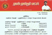 க.எண்: 2023030122 நாள்: 25.03.2023 அறிவிப்பு: காஞ்சிபுரம் மாவட்டம், காஞ்சிபுரம் தொகுதியைச் சார்ந்த வெ.ஜோஷி (12551621603) அவர்கள் நாம் தமிழர் கட்சி – காஞ்சிபுரம் தொகுதியின் குருதிக்கொடைப் பாசறைச் செயலாளராக நியமிக்கப்படுகிறார். இவர்கள் அனைவருக்கும், கட்சியின் அனைத்துநிலைப் பொறுப்பாளர்களும்,...