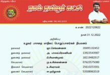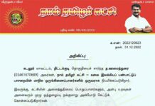 க.எண்: 2022120623 நாள்: 31.12.2022 அறிவிப்பு:      கடலூர் மாவட்டம், திட்டக்குடி தொகுதியைச் சார்ந்த த.ஊமைத்துரை (03461670689) அவர்கள், நாம் தமிழர் கட்சி – கலை இலக்கியப் பண்பாட்டுப் பாசறையின் மாநில ஒருங்கிணைப்பாளர்களில் ஒருவராக நியமிக்கப்படுகிறார். இவருக்கு, கட்சியின்...