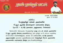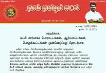 மேற்காண் அனைவரும் நாம் தமிழர் கட்சி – ஒருங்கிணைந்த தஞ்சாவூர் மாவட்டத்திற்கான பாசறைப் பொறுப்பாளர்களாக நியமிக்கப்படுகிறார்கள். இவர்கள் அனைவருக்கும்,...