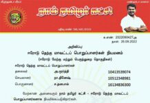 க.எண்: 2022090431 நாள்: 28.09.2022 அறிவிப்பு: தஞ்சாவூர் தொகுதிப் பொறுப்பாளர்கள் நியமனம் தலைவர் - க.இரமேஷ்குமார் - 13473117791 துணைத் தலைவர் - பா.பிரதாப் - 12241190774 துணைத் தலைவர் - கு.முரளி கிருட்டிணன் - 13485980434 செயலாளர் - து.சமீர் அகமது - 17237529336 இணைச் செயலாளர் - எ.விஜய் அமல் ராஜ் - 18184687800 துணைச் செயலாளர் - இரா.விமல் - 10645926823 பொருளாளர் - சா.முகமது இதிரிஸ் - 18522668810 செய்தித் தொடர்பாளர் - கு.அ.அபினேஷ் - 13482679915 மேற்காண் அனைவரும் நாம் தமிழர் கட்சி - தஞ்சாவூர் தொகுதிப் பொறுப்பாளர்களாக...