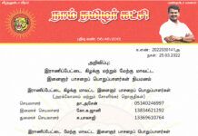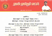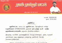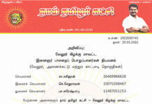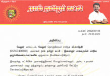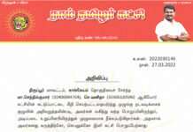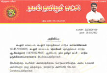 க.எண்: 2022030139 நாள்: 25.03.2022 அறிவிப்பு:      கடலூர் மாவட்டம், கடலூர் தொகுதியைச் சார்ந்த வா.செங்கோலன் (03457395869), கடலூர் மாவட்டம், நெய்வேலி தொகுதியைச் சார்ந்த ஆ.சிவக்குமார் (14703022863) ஆகியோர், நாம் தமிழர் கட்சி - மாநில ஒருங்கிணைப்பாளர்களாக...
