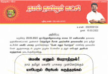க.எண்: 2022030124 நாள்: 15.03.2022 அறிவிப்பு: வருகின்ற 20.03.2022 ஞாயிற்றுக்கிழமையன்று காலை 10 மணியளவில் தலைமை ஒருங்கிணைப்பாளர் அண்ணன் செந்தமிழன் சீமான் அவர்களின் தலைமையில் நாம் தமிழர் கட்சியின் மகளிர் பாசறை முன்னெடுக்கும் "பெண் எனும் பேராற்றல்"...