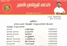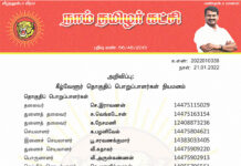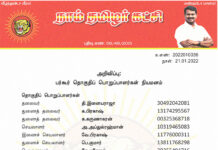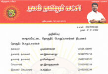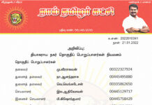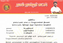 க.எண்: 2022010040 நாள்: 21.01.2022 அறிவிப்பு: நாகப்பட்டினம் மாவட்டப் பொறுப்பாளர்கள் நியமனம் (நாகப்பட்டினம், கீழ்வேளூர் மற்றும் வேதாரண்யம் தொகுதிகள்) தலைவர் வே.அறிவொளி 14480495370 செயலாளர் கு.இராசேந்திரன் 14480465521 பொருளாளர் மா.மதியழகன் 14483214681 மேற்காண் அனைவரும் நாம் தமிழர் கட்சி - நாகப்பட்டினம் மாவட்டப் பொறுப்பாளர்களாக நியமிக்கப்படுகிறார்கள். இவர்கள் அனைவருக்கும், கட்சியின் அனைத்துநிலைப் பொறுப்பாளர்களும், அன்பு...