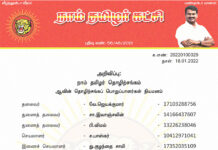 க.எண்: 2022010030 நாள்: 19.01.2022 அறிவிப்பு: மாநில ஒருங்கிணைப்பாளர்கள் நியமனம் பொறுப்பாளர் பெயர் உறுப்பினர் எண் சேது.மனோகரன் 16133740231 ந.கிருஷ்ணகுமார் 13471998752 லெ.மாறன் 25389392814 து.நடராஜன் 15751721535 மேற்காண் அனைவரும் நாம் தமிழர் கட்சி - மாநில ஒருங்கிணைப்பாளர்களாக நியமிக்கப்படுகிறார்கள். இவர்கள் அனைவருக்கும், கட்சியின் அனைத்துநிலைப் பொறுப்பாளர்களும், அன்பு உறவுகள் அனைவரும் முழு...