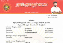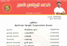 க.எண்: 2022010031அ நாள்: 20.01.2022 தலைமை அறிவிப்பு: மாநில கொள்கைப்பரப்புச் செயலாளர்கள் நியமனம் பொறுப்பாளர் பெயர் உறுப்பினர் எண் புதுக்கோட்டை கு.ஜெயசீலன் 37446158505 பேராவூரணி க.திலீபன் 13484901302 துருவன் செல்வமணி 16450397661 அ.துரைமுருகன் 16450527843 செ.அருண் ஜெயசீலன் 14096537986 திருச்சி இரா.சரவணன் 16448263039 பா.வெ.சிவசங்கரன் 20025593947 க.அருண்குமார் 05350591079 தஞ்சை க.கரிகாலன் 14293048764 மு.இடிமுரசு 02309476557 இ.எல்லாளன் யூசுப் 01647248431 திருத்துறைப்பூண்டி ப.சக்திவேல் 14212816584 ந.ஸ்ரீராம் 11419872783 மூ.அருணகிரி 17442900397 ச.நல்லான் 07868438157 மேற்காண் அனைவரும் நாம் தமிழர் கட்சி -...