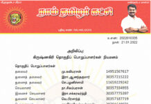 க.எண்: 20220100029 நாள்: 18.01.2022 அறிவிப்பு: நாம் தமிழர் தொழிற்சங்கம் ஆவின் தொழிற்சங்கப் பொறுப்பாளர்கள் நியமனம் தலைவர் - வே.ஜெயக்குமார் - 17103288756 துணைத் தலைவர் - சா.இவாஞ்சலின் - 14166437607 துணைத் தலைவர் - பி.விமல் - 13226238046 செயலாளர் - ச.பாஸ்கர் - 10412971041 இணைச் செயலாளர் - து.குழந்தை சாமி - 17352035109 துணைச் செயலாளர் - த.ஸ்ரீகார்த்திகேயன் - 13266875669 பொருளாளர் - ப.விக்னேஷ் - 16150811254 மேற்காண் அனைவரும் ஆவின் நிறுவனத்தின் 25 ஒன்றியங்களிலும், நாம்தமிழர் ஆவின் தொழிற்சங்கத்தைக் கட்டமைக்கும் பணிக்கான...